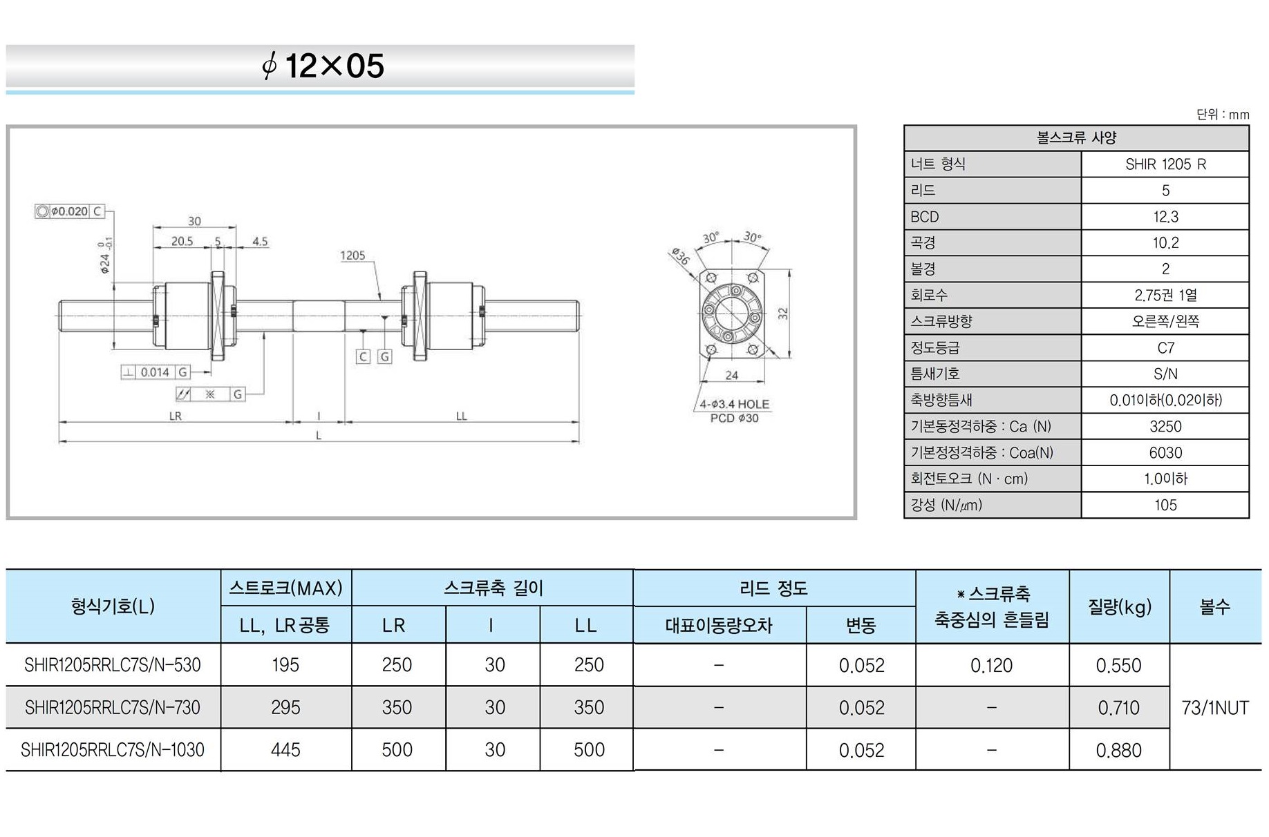 ISSOKU의 좌,우 일체형 볼스크류로 직경 φ12, φ15, φ16 및 φ20으로 4종이 생산되며, C7급 연삭 볼스크류입니다.