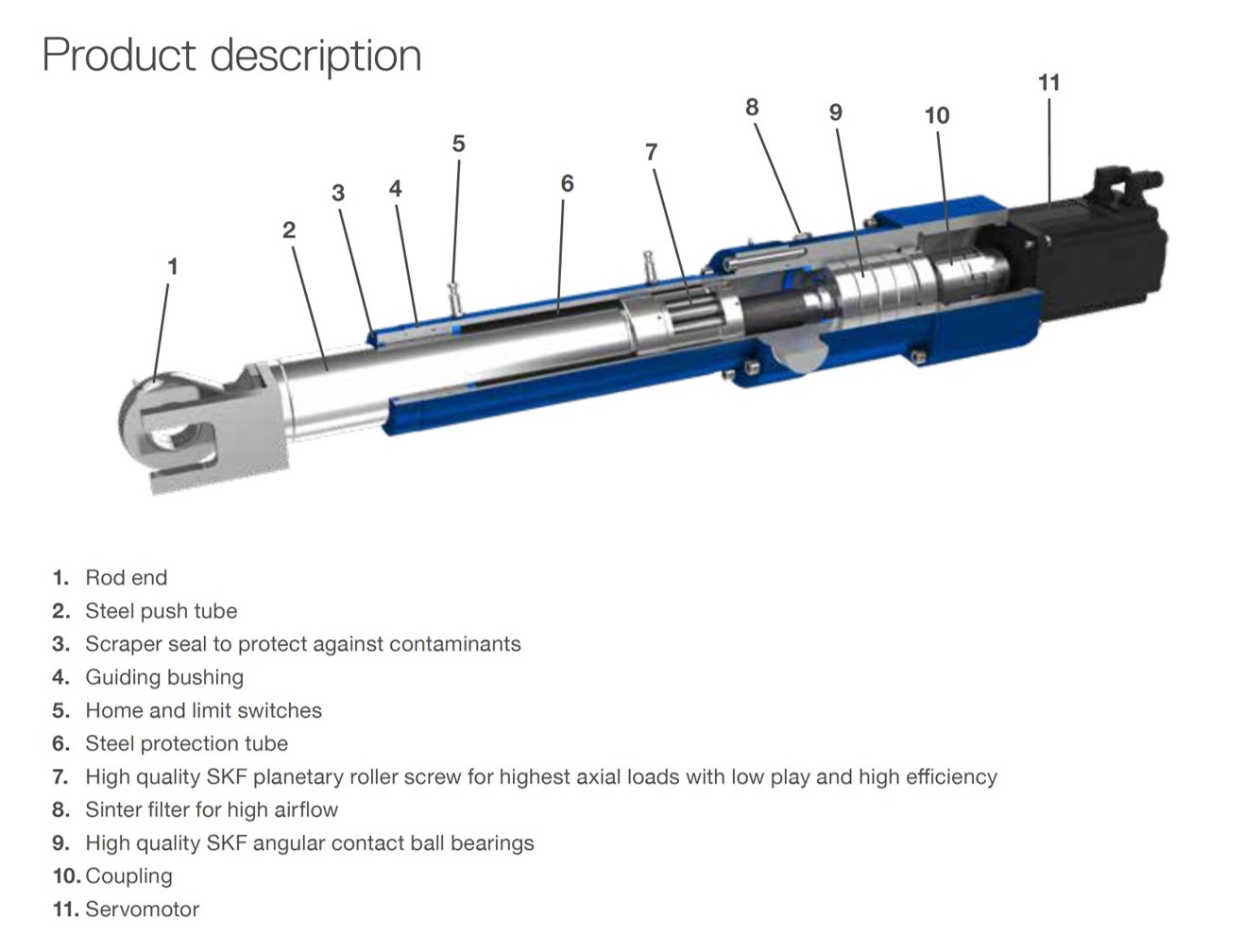 SKF Motion Technologies의 고품질 롤러 스크류가 장착되어 있음으로 인해 극도로 높은 하중과 완벽한 제어를 할 수 있으며 매우 효율적인 직선운동을 수행할 수 있습니다.