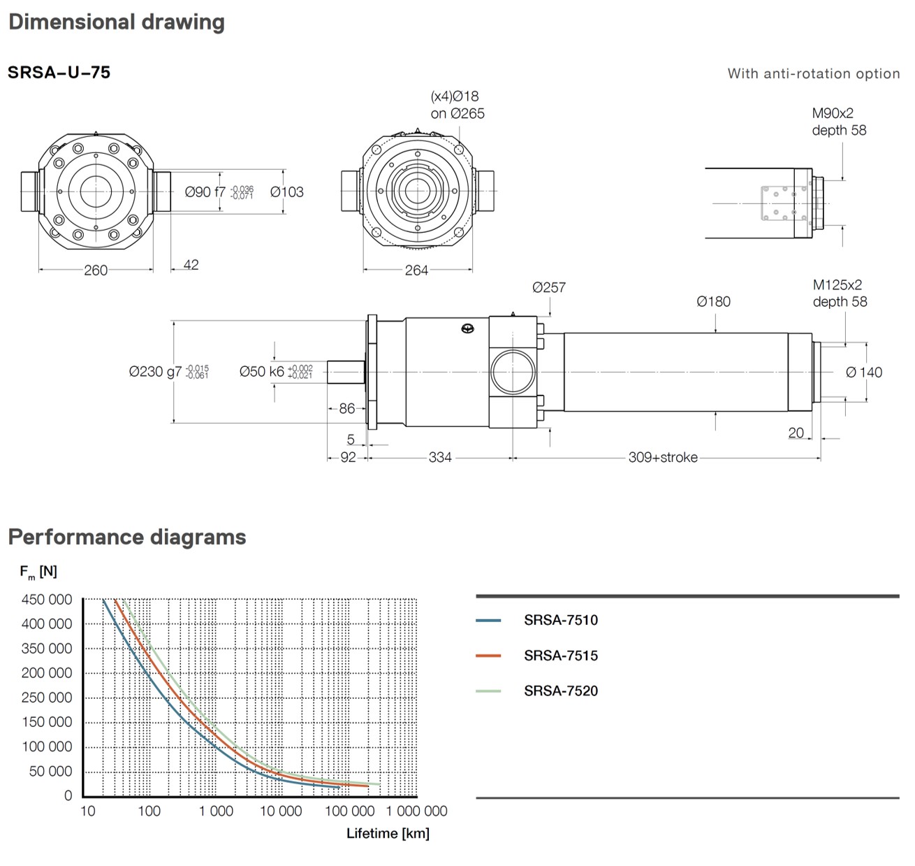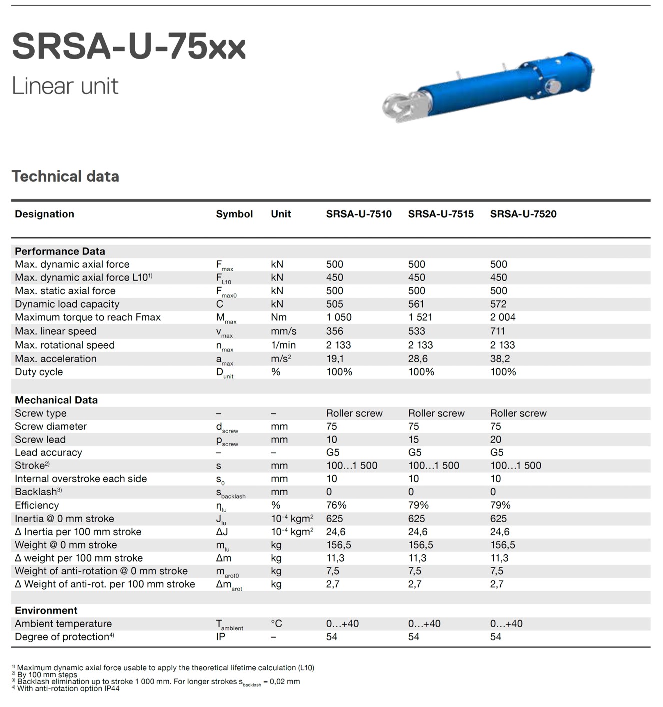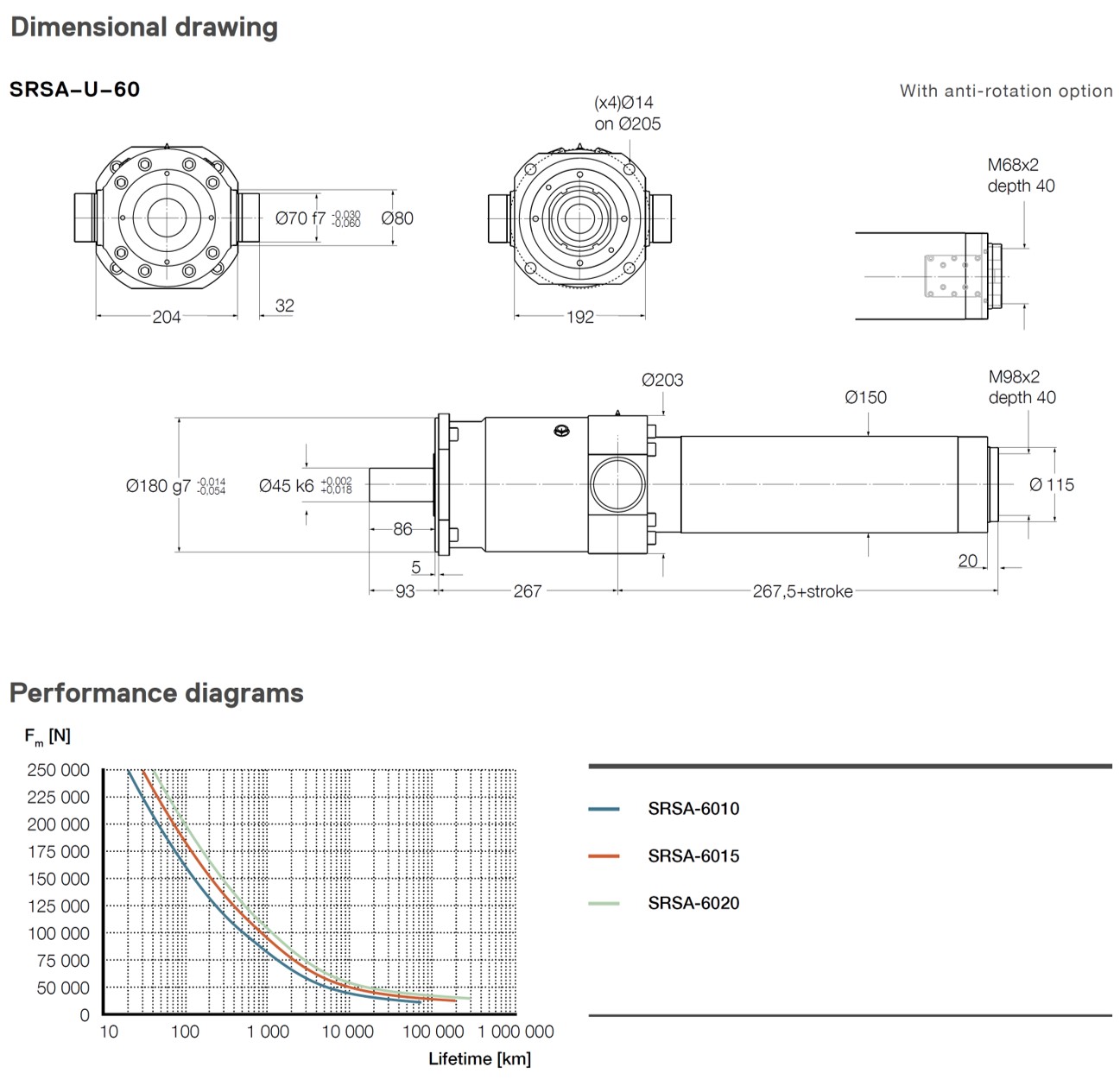 Max 500kN의 최대 힘을 가진 SRSA는 높은 하중을 필요로 하는 애플리케이션에서의 전기 실린더 사용이 가능하게 하여, 유압실린더 만의 영역에서도 적용이 가능하도록 하였습니다.