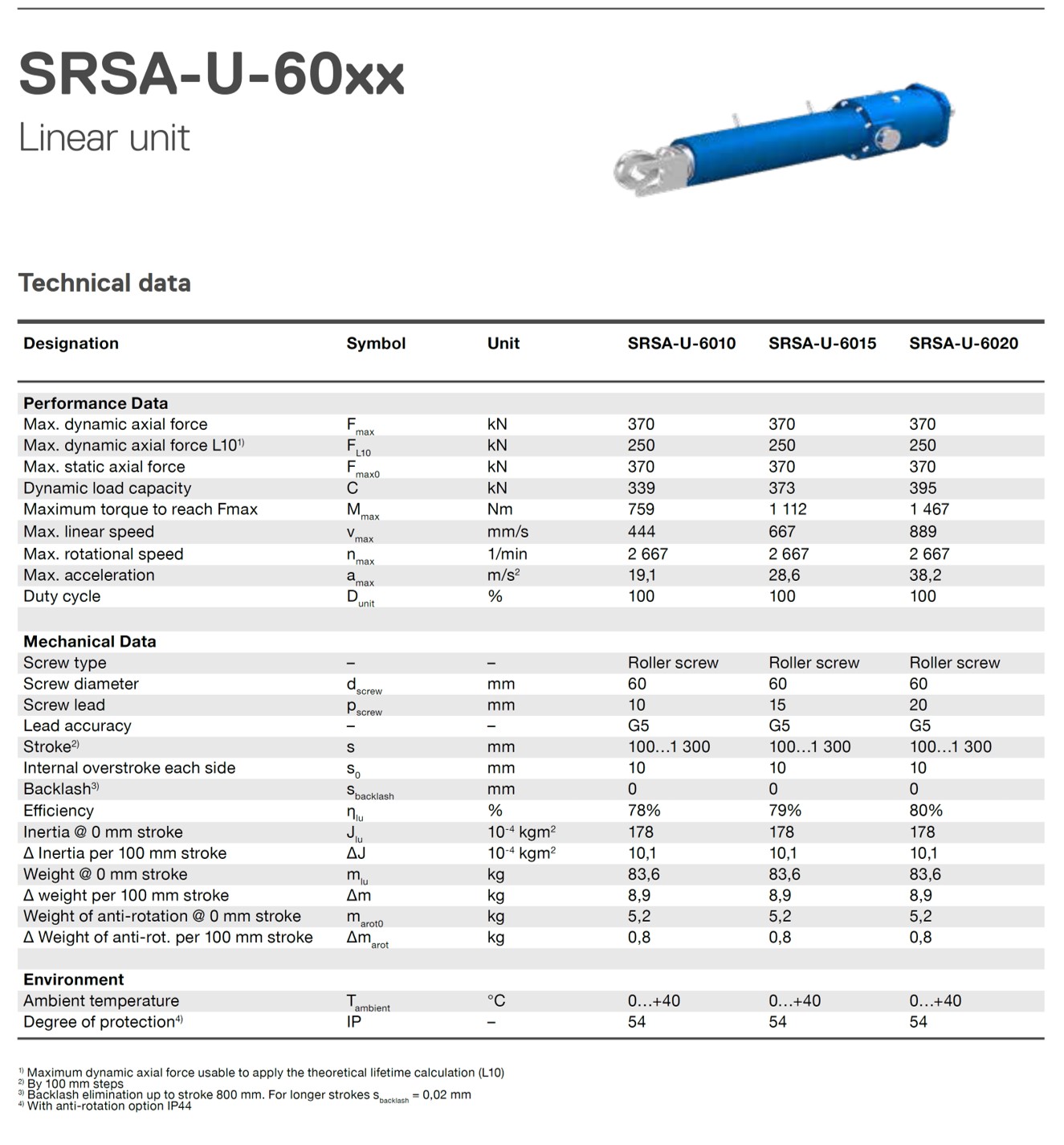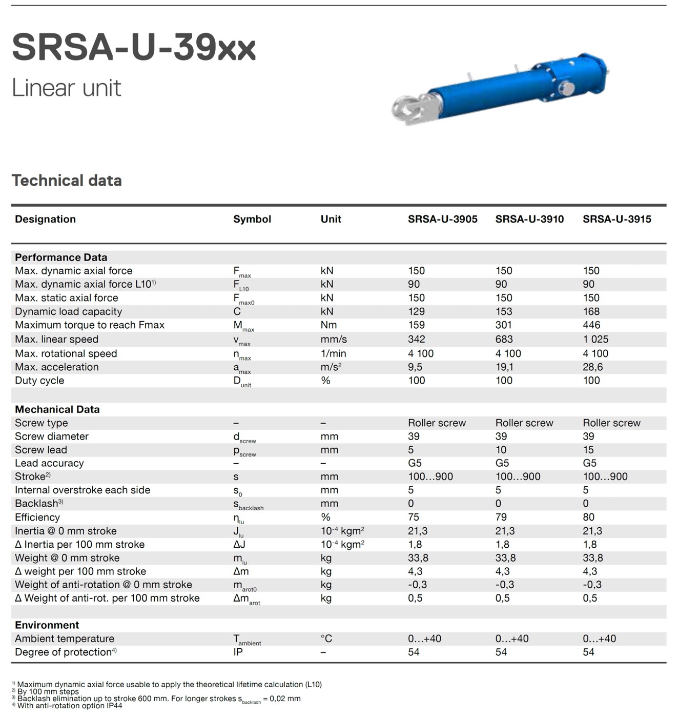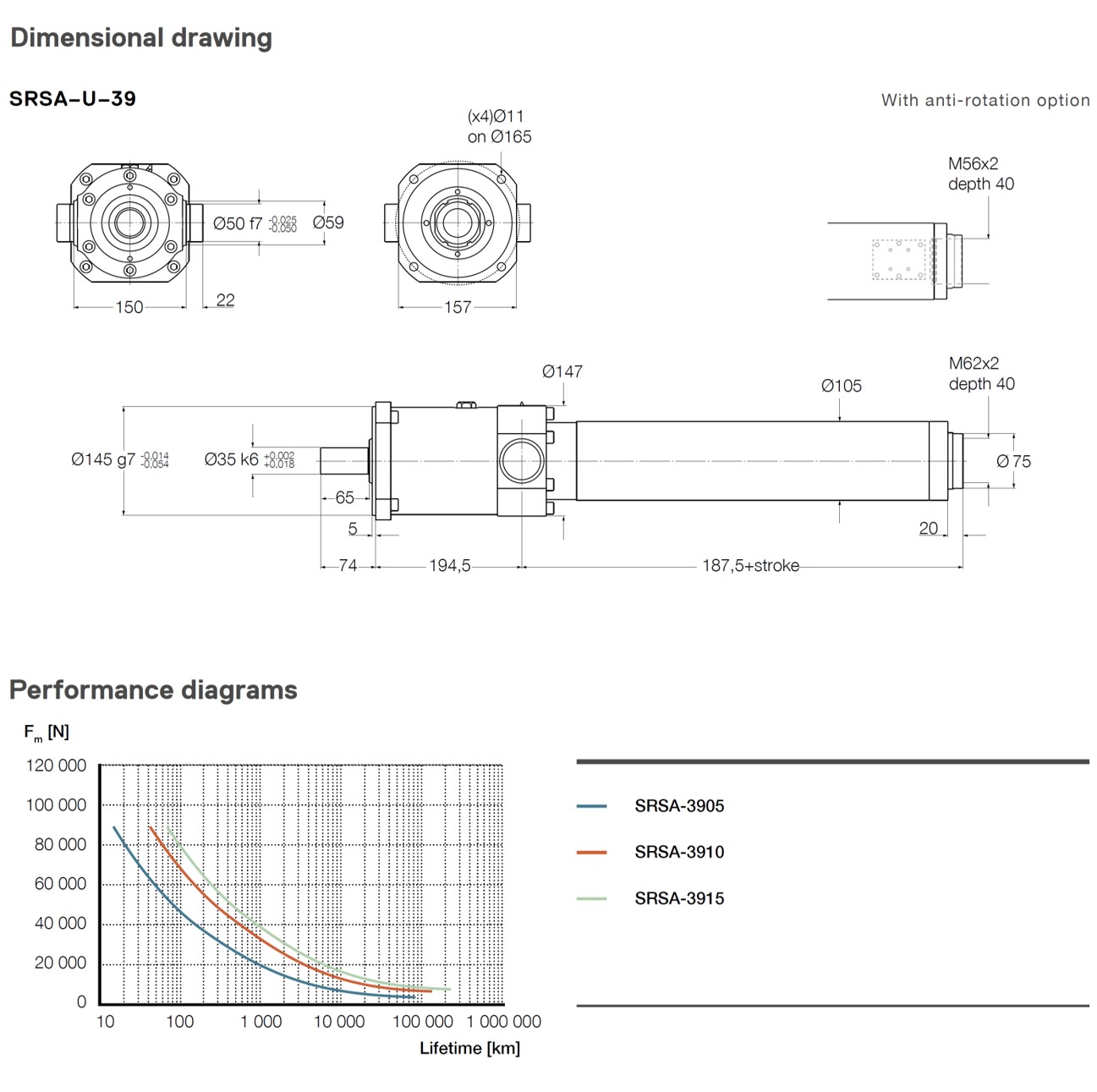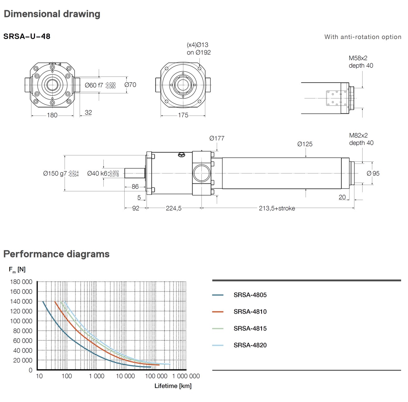 Max 500kN의 최대 힘을 가진 SRSA는 높은 하중을 필요로 하는 애플리케이션에서의 전기 실린더 사용이 가능하게 하여, 유압실린더 만의 영역에서도 적용이 가능하도록 하였습니다.