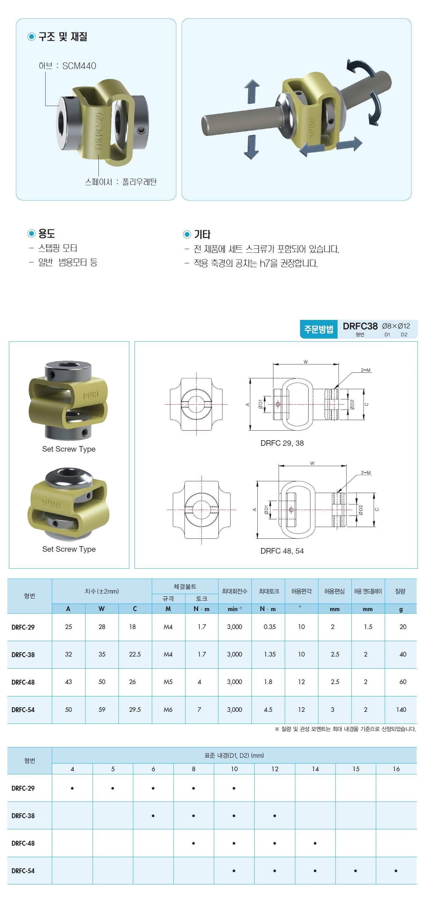 자동화부품 커플링 DRFC 커플링 DRFC point ■ 일체형 플렉시블 커플링 ■ 큰 편각, 편심, 엔드 플레이의 흡수 능력이 우수 ■ 충격 및 진동을 흡수 ■ 관성모멘트가 낮음 LIST CATALOG DOWND Detail