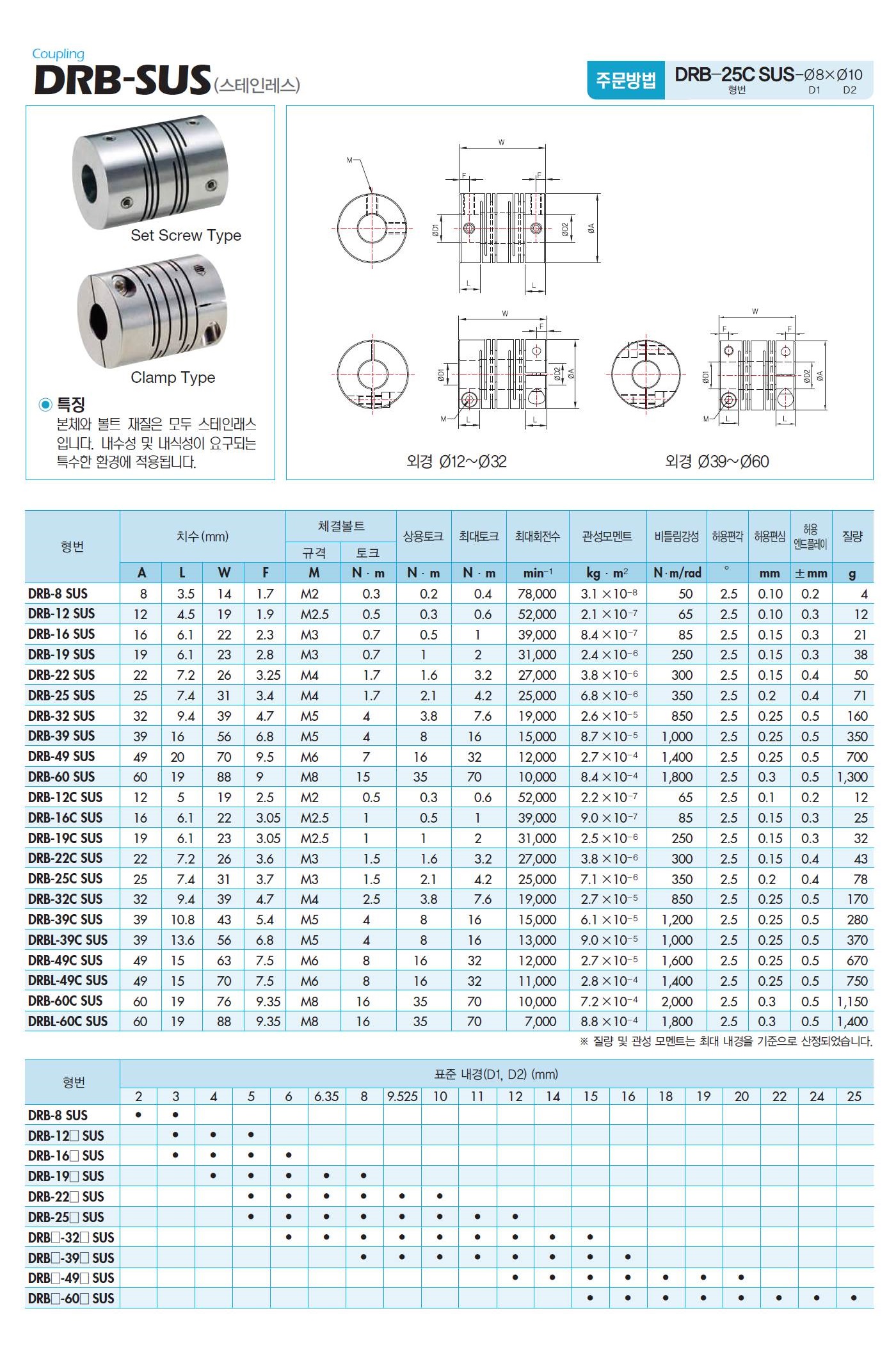 자동화부품 커플링 DRB (SUS) 커플링 DRB (SUS) point ■ 본체와 볼트 재질은 모두 스테인레스 ■ 내수성 및 내식성이 요구되는 특수한 환경에 적용 LIST CATALOG DOWND Detail