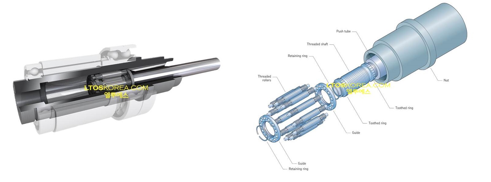 나선의 형태는 높은 하중 이송 용량과 고강성을 위해 큰 접촉 반경을 만들 수 있도록 원통형으로 되어 있으며,롤러를 고정하는 케이지는 롤러가 스크류 축에 평행을 유지하고 그 주변에 일정하게 간격을 유지합니다. 롤러 스크류 너트의 내부에서 일 회전한 후 롤러는 하나의 나선을 축 방향으로 이동하게 됩니다. 그다음 너트 내부의 축 방향 홈으로 들어가고 따라서 너트와 축 나선과 분리됩니다.