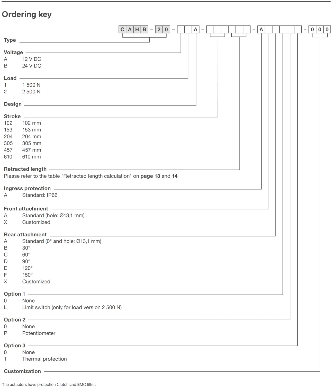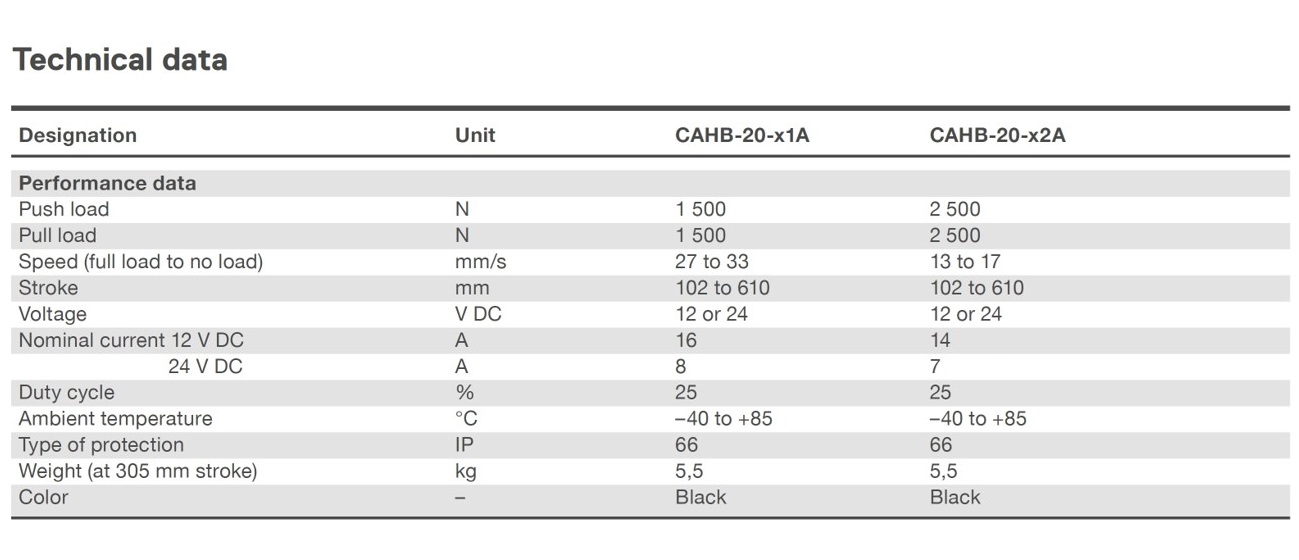 리니어 액추에이터 CAHB 20A는 적용 온도 -40℃~+85℃로 넓은 범위에서 사용이 가능하며, 방진방수 등급 IP66 환경에서 작동할 수 있도록 설계된 전자 기계식 선형 액추에이터 입니다.