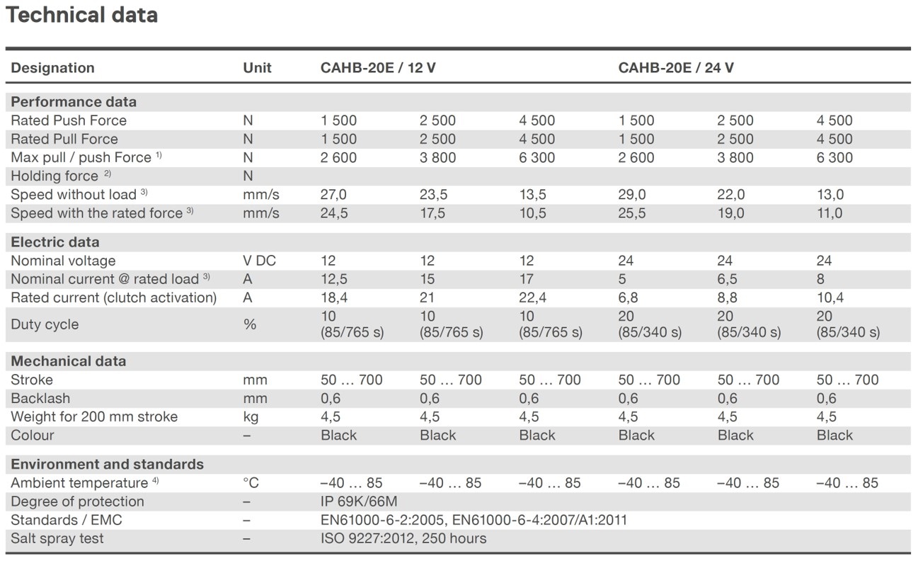 리니어 액추에이터 CAHB 20E는 적용 온도 -40℃~+85℃로 넓은 범위에서 사용이 가능하며, 높은 방진방수 등급인 IP 69K/66M으로 열악한 환경에서 작동할 수 있도록 설계된 전자 기계식 선형 액추에이터 입니다.