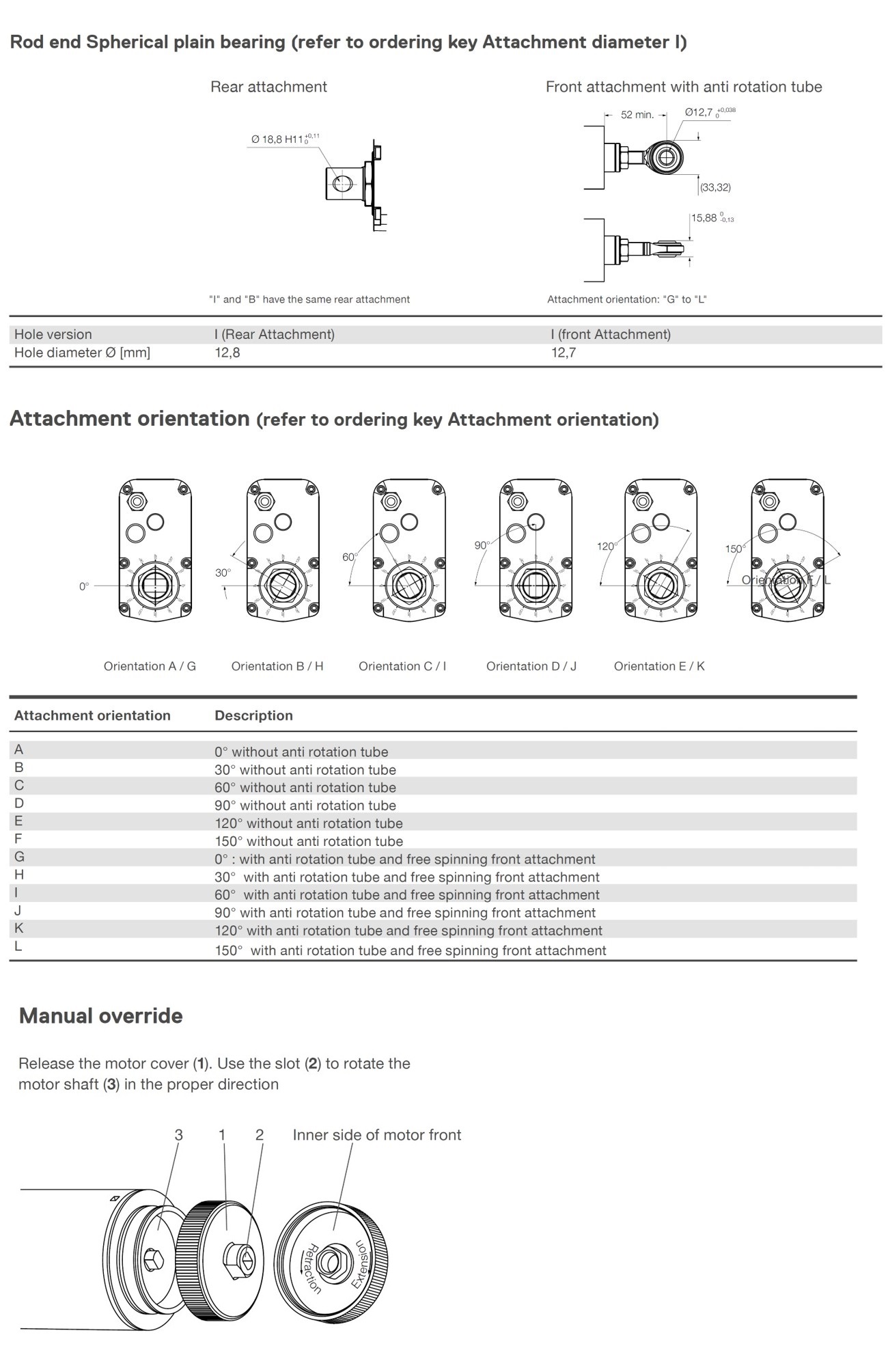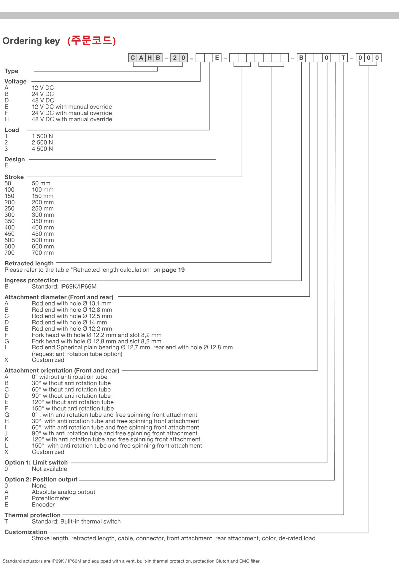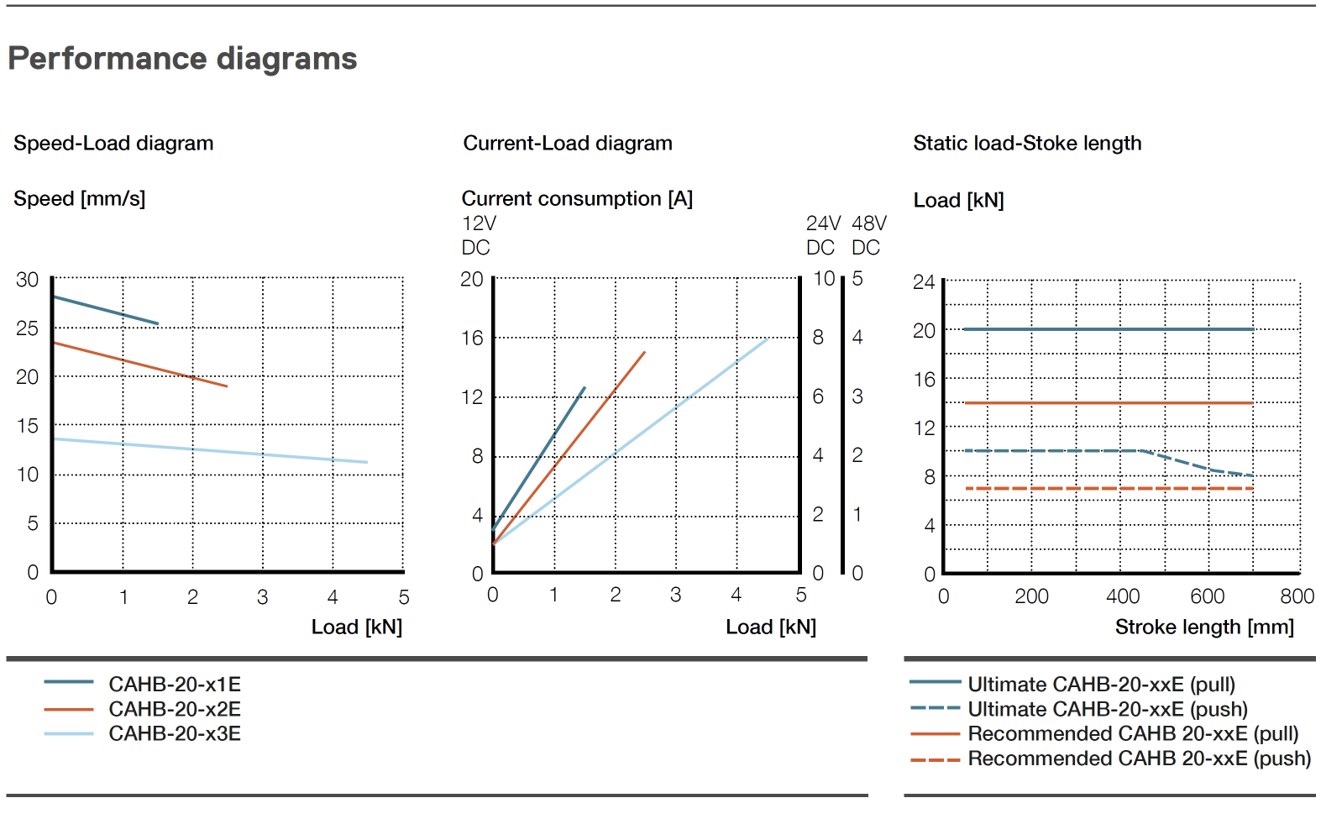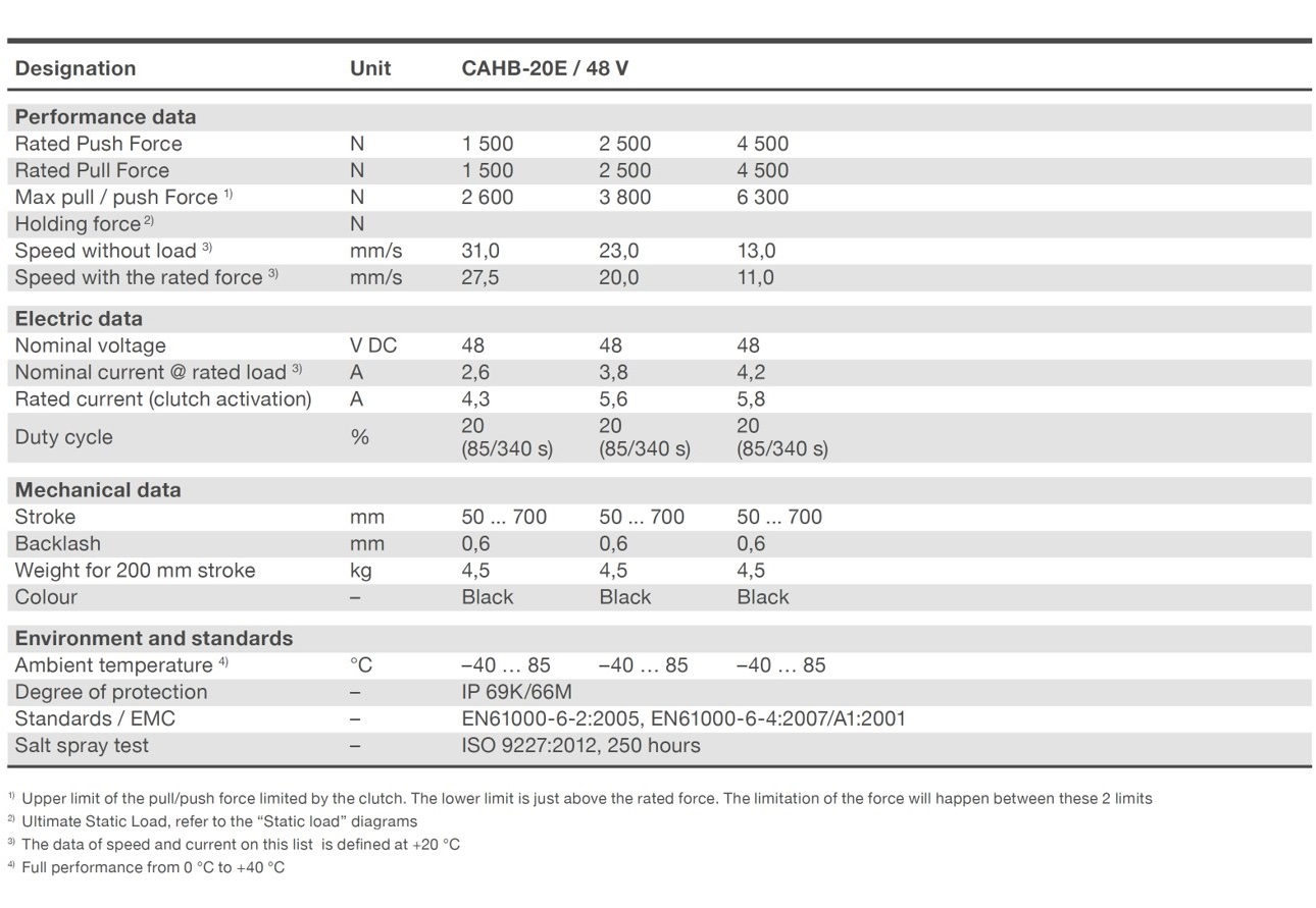 Linear Actuator CAHB 20E는 낮은 백래쉬, 수동 재 지정 옵션, Limit switch 옵션, 가변 저항기로 임의의 위치를 구분할 수 있는 Potentiometer 및 Encoder 옵션을 제공합니다. 또한 새롭게 추가된 주행 튜브의 회전 방지 옵션을 선택하여 구매할 수 있습니다. 장착 모터는 DC 12V, DC 24V 및 DC 48V 중 선택 가능합니다.