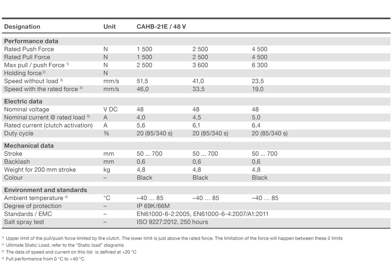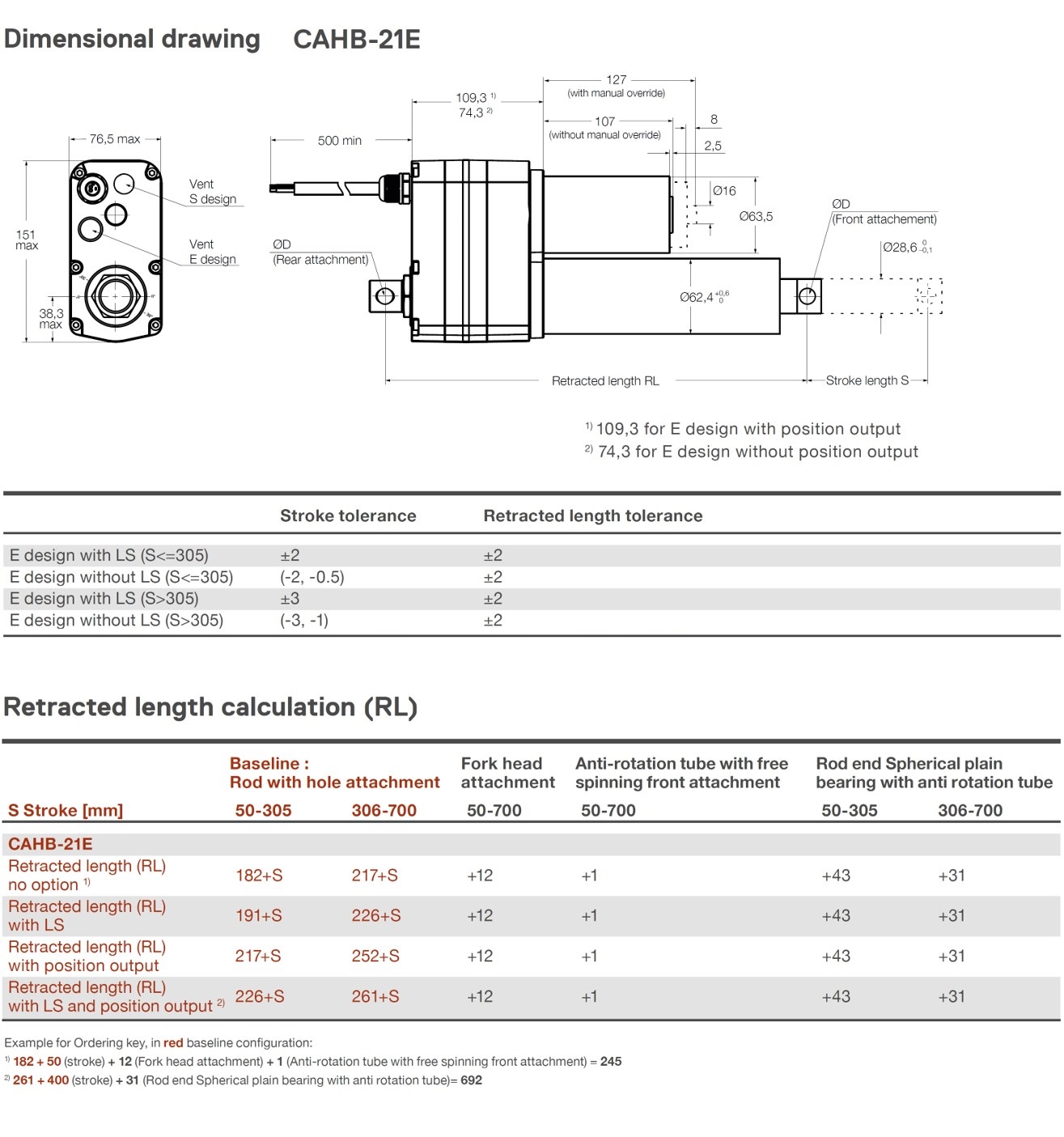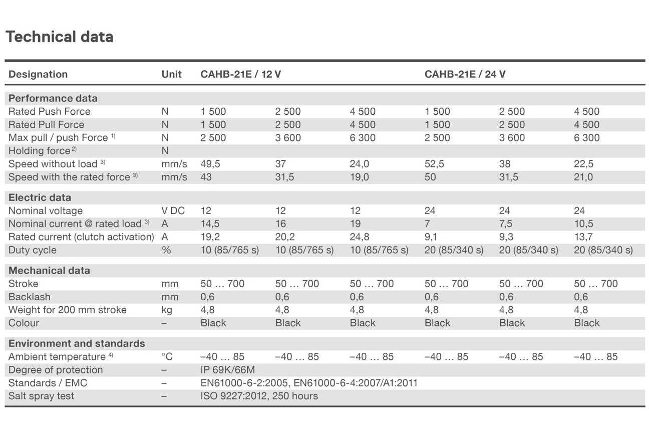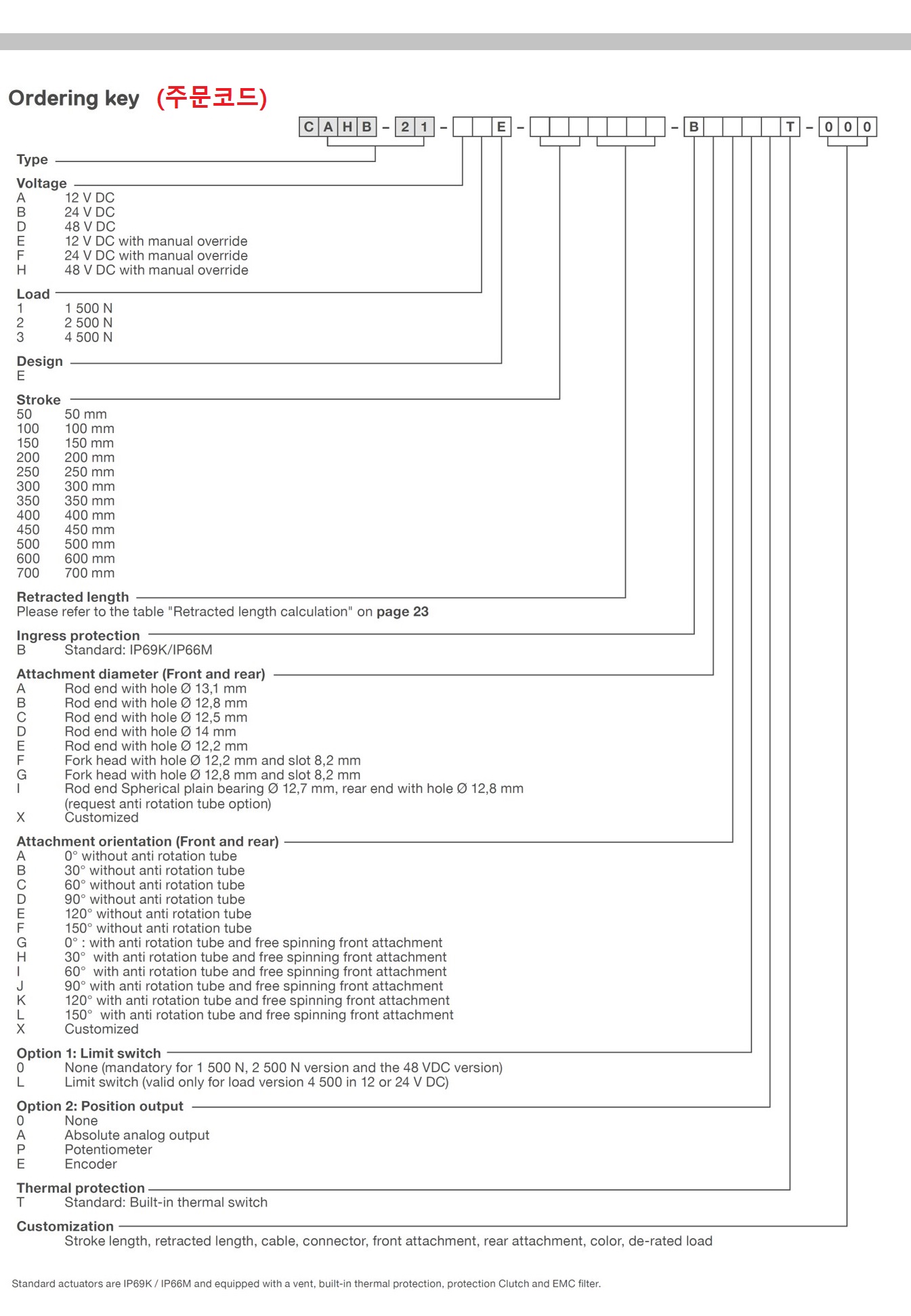 선형 리니어 액추에이터 CAHB 21E는 낮은 백래쉬, 수동 재 지정 옵션, Limit switch 옵션, 가변 저항기로 임의의 위치를 구분할 수 있는 Potentiometer 및 Encoder 옵션을 제공합니다. 또한 새롭게 추가된 주행 튜브의 회전 방지 옵션을 선택하여 구매할 수 있습니다. 장착 모터는 DC 12V, DC 24V 및 DC 48V 중 선택 가능합니다.