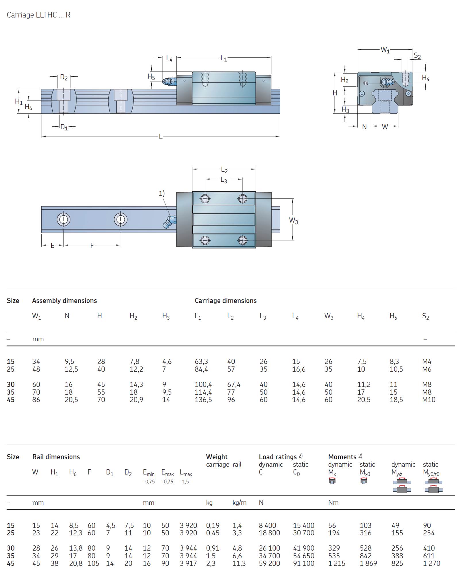 SKF LMGuide는 DIN 규격에 따라 100,000m를 기준으로 동정격하중과 모멘트 하중이 표기되며 생산됩니다.