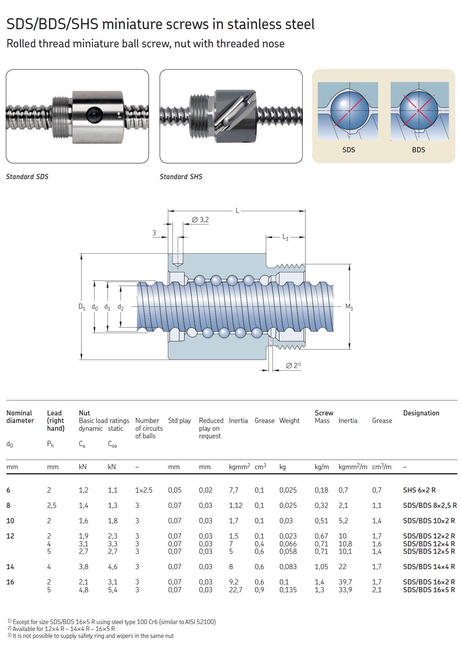SDS 타입은 일반적인 플랜지 타입이 아닌 체결형 너트 타입으로 공급되는 Stainless steel 재질의 볼스크류입니다. 일반적은 베어링강의 제품을 원할 경우는 SD, SH 모델을 참고하시면 됩니다. 선택적으로 백래쉬 제거형 'BDS'로 선택 적용할 수 있습니다. 체결형 타입의 볼스크류는 액추에이터 또는 실린더류 제품에 Ball screw 적용 시 사용자의 어플리케이션 공간 절약을 구현할 수 있습니다. Stainless steel 재질의 제품은 장납기 품목입니다.