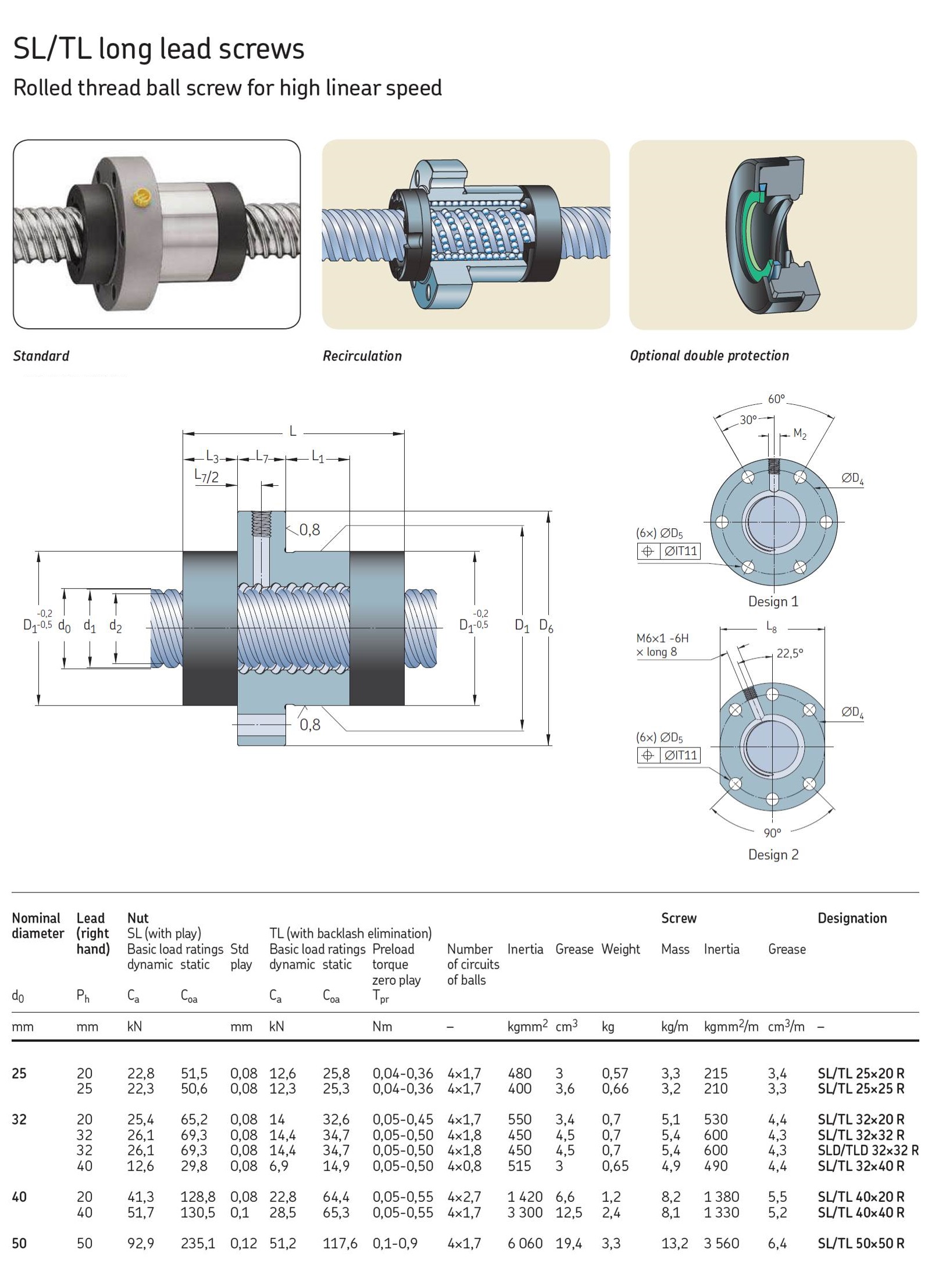 SL 타입의 볼스크류는 엔드 캡 방식으로 표준 와이퍼 또는 선택적 이중 와이퍼를 적용할 수 있으며, 최대 회전속도 n×d0 = 90,000으로 최고 110 m/min의 높은 속도 구현 가능합니다.