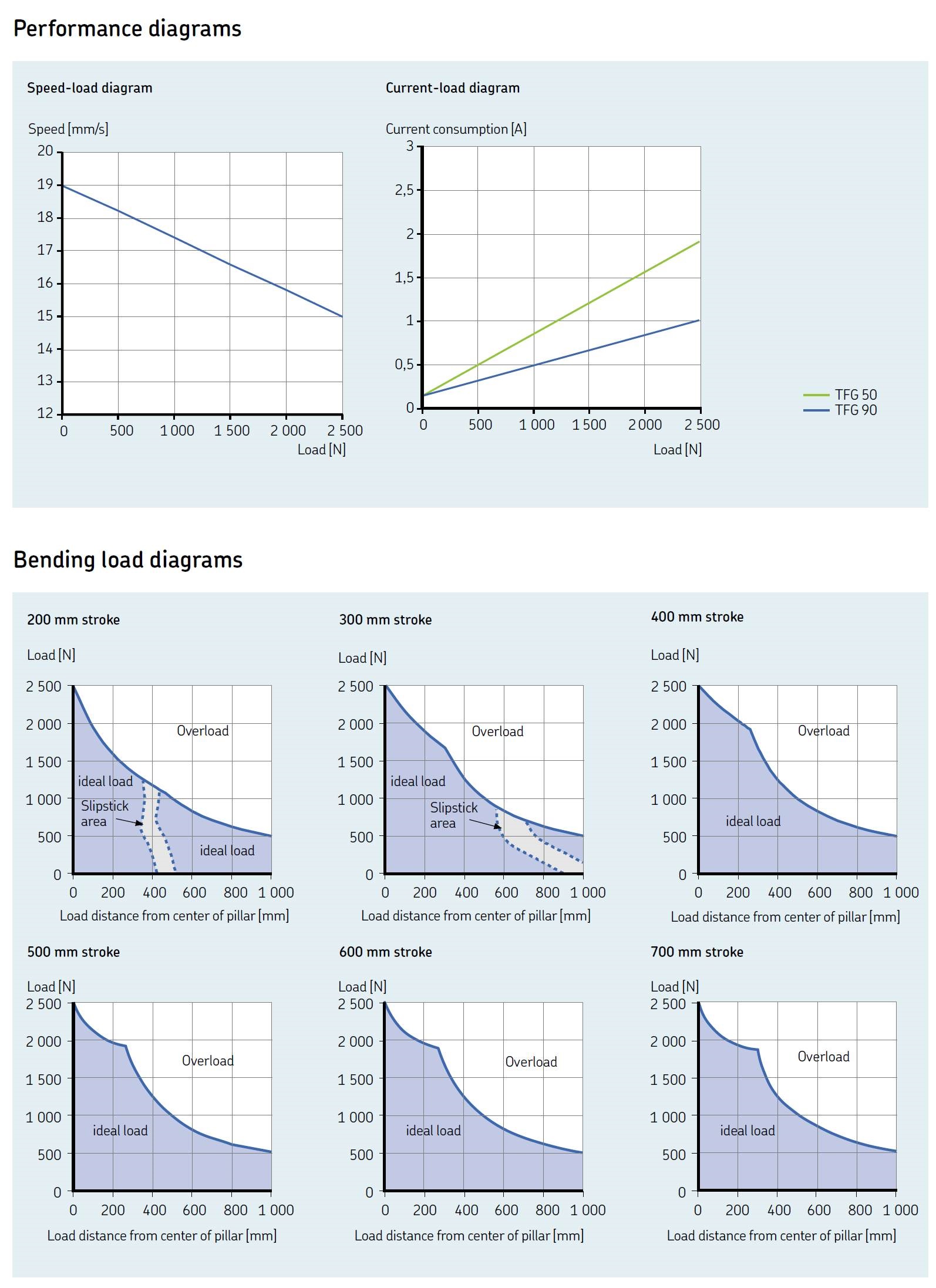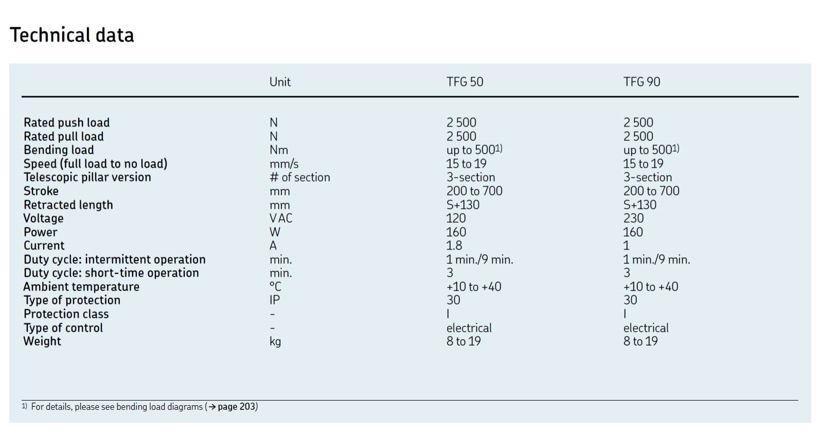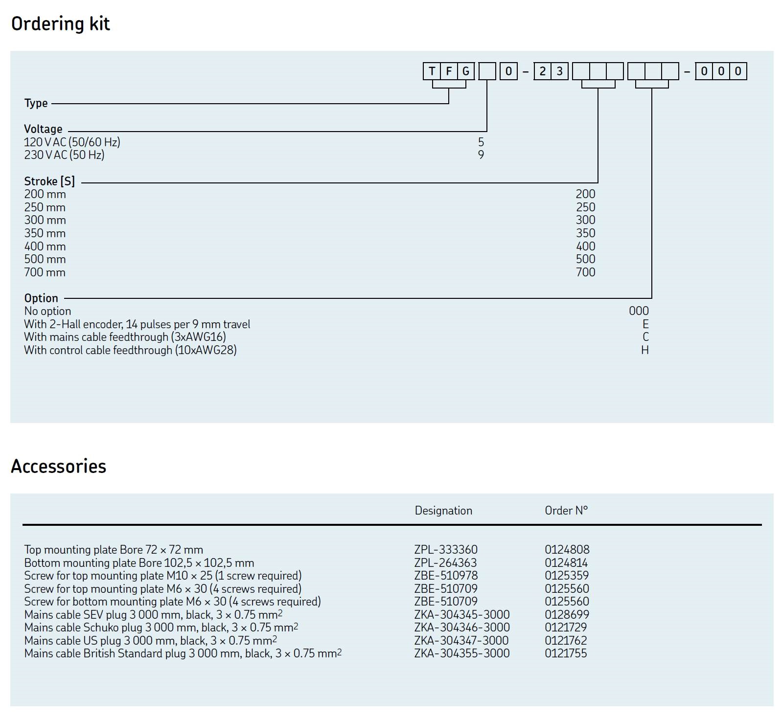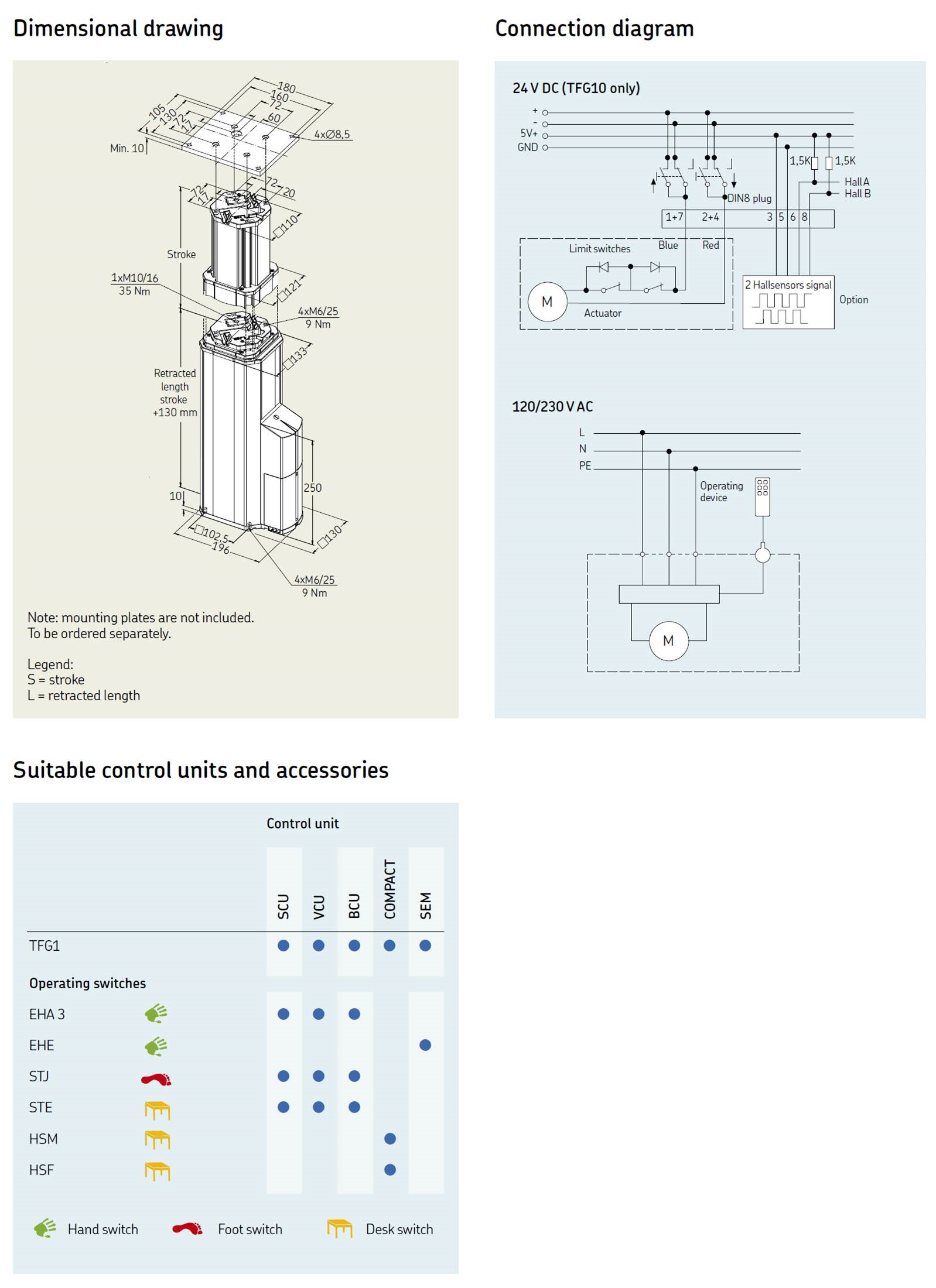 SKF Motion Technologoes TFG는 Push와 Pull 용도로 사용할 수 있는 DC 모터(TFG-10 only)와 AC 모터를 사용하는 전기 리프트 시리즈입니다.