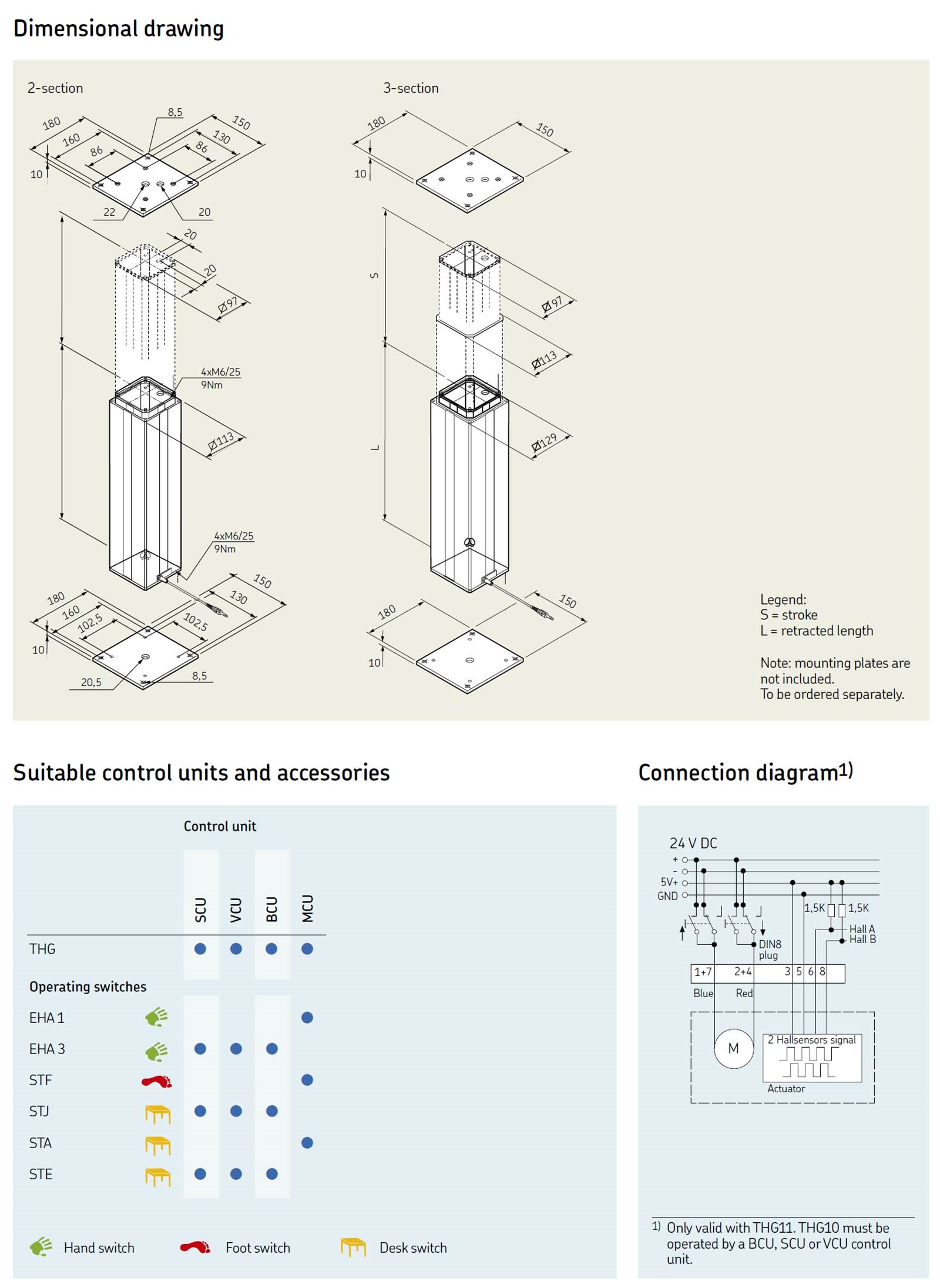 THG Telescopic pillar는 슬림하고 컴팩트한 디자인으로 하중 2,000N까지 Push 처리할 수 있습니다. THG는 선택적 위치 피드백 기능이 있는 DC 모터를 사용하며, Bending load의 검토가 필요한 어플리케이션을 위한 제품으로 의료 기기를 포함하여 적용이 가능하며, 기타 액세서리와 같은 시스템으로 제공될 수 있습니다.