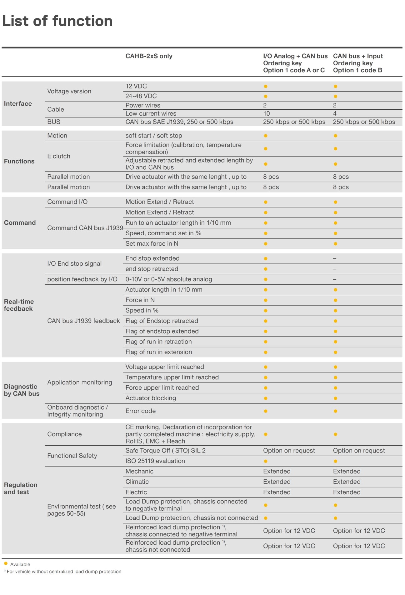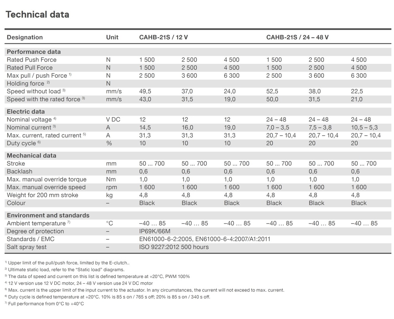 기존의 선형 리니어 액추에이터 CAHB 2xE 시리즈와 같이 적용 온도 -40℃~+85℃로 넓은 범위에서 사용이 가능하며, 높은 방진방수 등급인 IP 69K/66M으로 열악한 환경에서 작동할 수 있는 기능은 동일하게 포함이 되어 있는 Smart Linear Actuator 입니다.